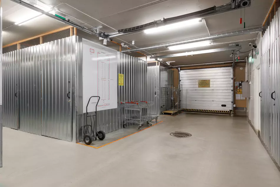 Varastorakennuksiin voit ajaa autolla sisälle, kaikki varastot ovat katutasossa. Varastoista löytyy monipuolisesti kärryjä tavaroiden kuljettamiseksi.